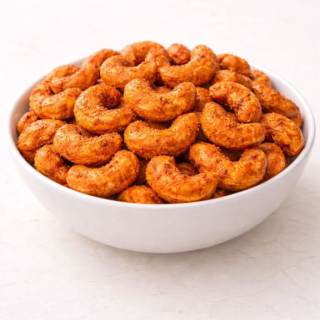 Spicy red chilli roasted cashews made from premium whole kernels. Crunchy, flavourful, and hygienically processed for bold snacking.
